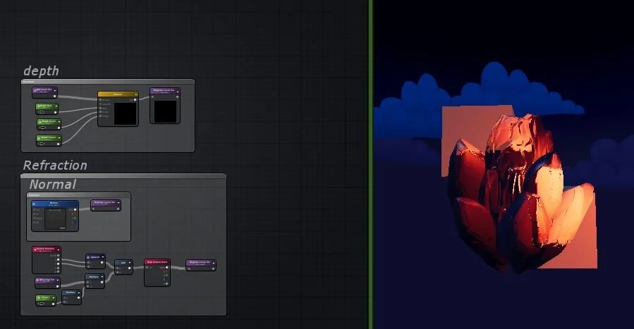 The normal and refraction is what gives the stone its gem-like surface texture, as well as making the stone have a transparent feel. This also distorts the objects that can be seen through the gem. This is all tinted by the albedo maps so the refracted image blends with the stone.